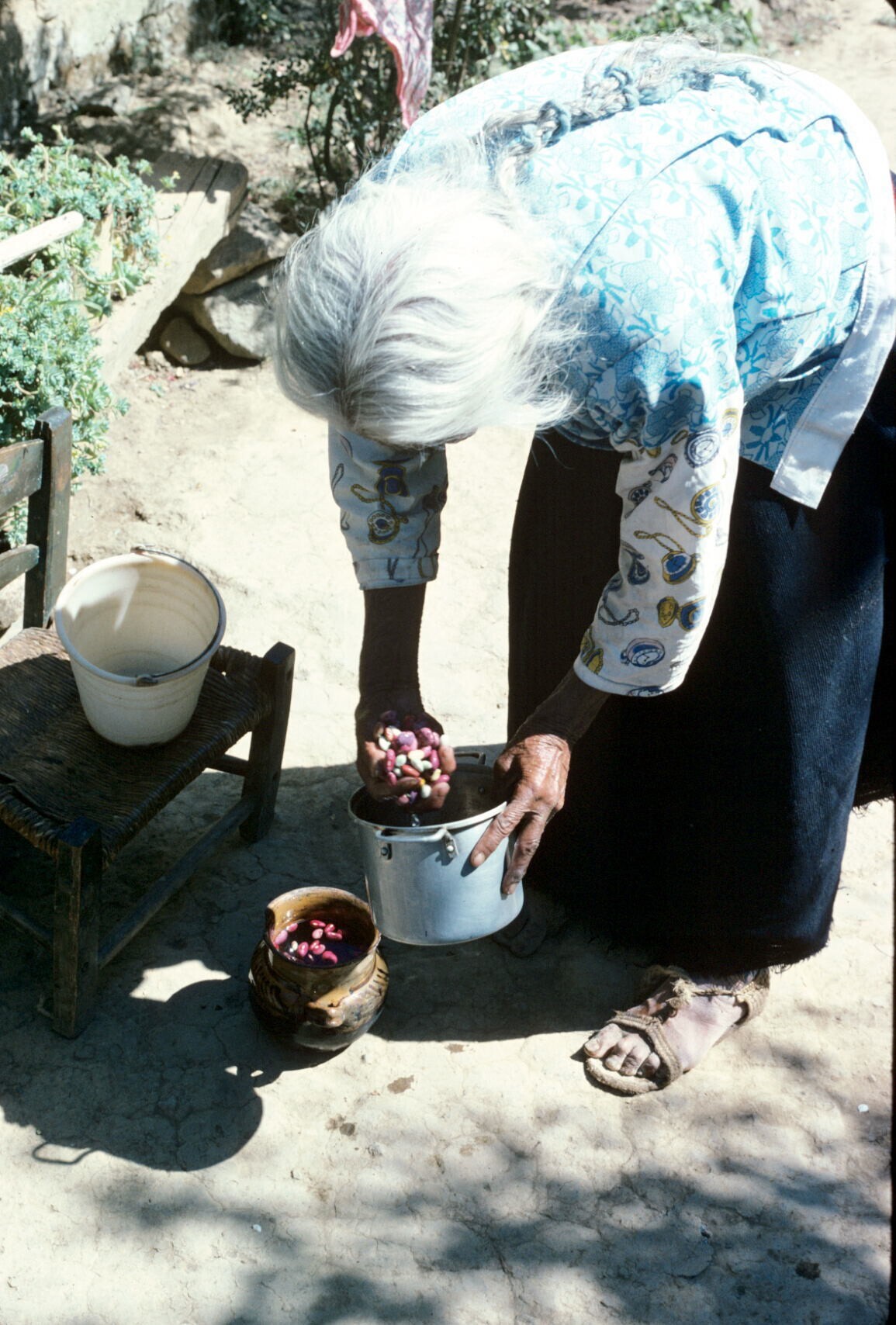 bejaarde verwante van Loreto Jarriza, bonen wassend