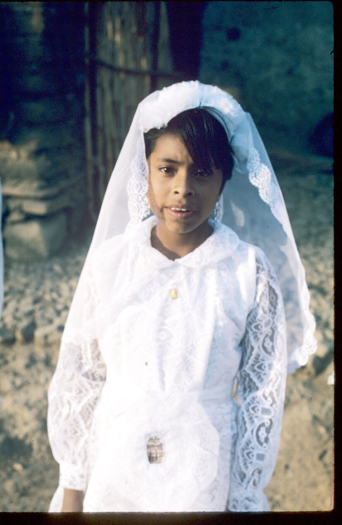 Macrina Castillo in haar Communiejurk, tussen haar o...