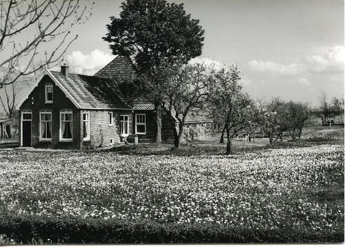 Foto in zwart-wit van een stelpboerderij aan een bre...