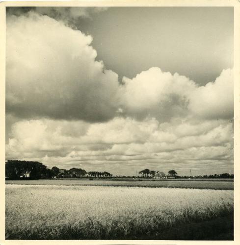 Foto in zwart-wit van een kop-rompboerderij bij Grou...