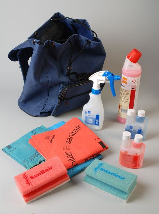 Blauwe rugzak met schoonmaakartikelen en materialen