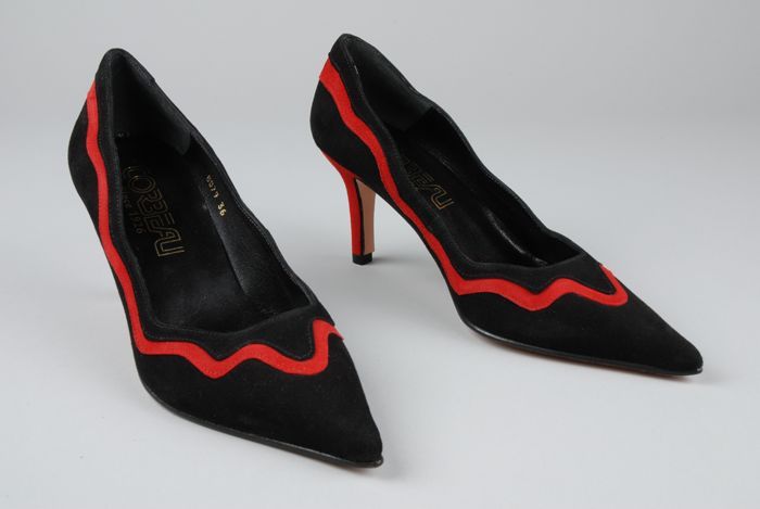 Paar damesschoenen met hoge hak, zwart met rode bies