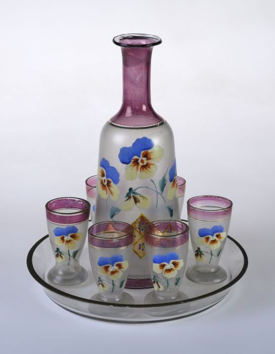 Karaf van borrelservies, blank glas, deels mat, besc...
