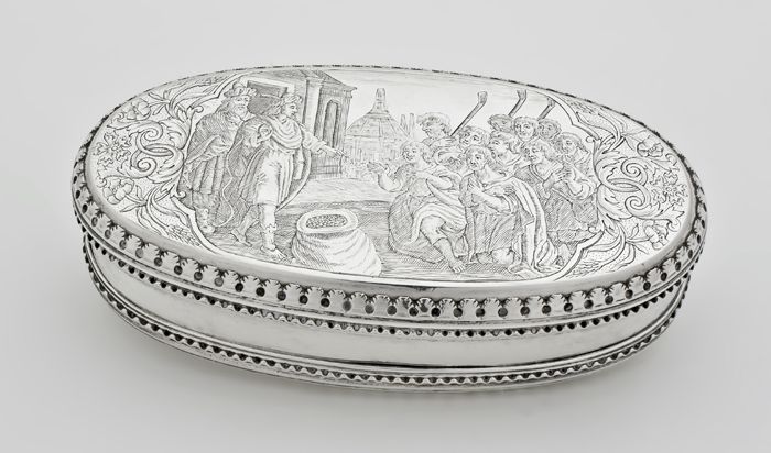Zilveren ovale tabaksdoos gegraveerd met voorstellin...