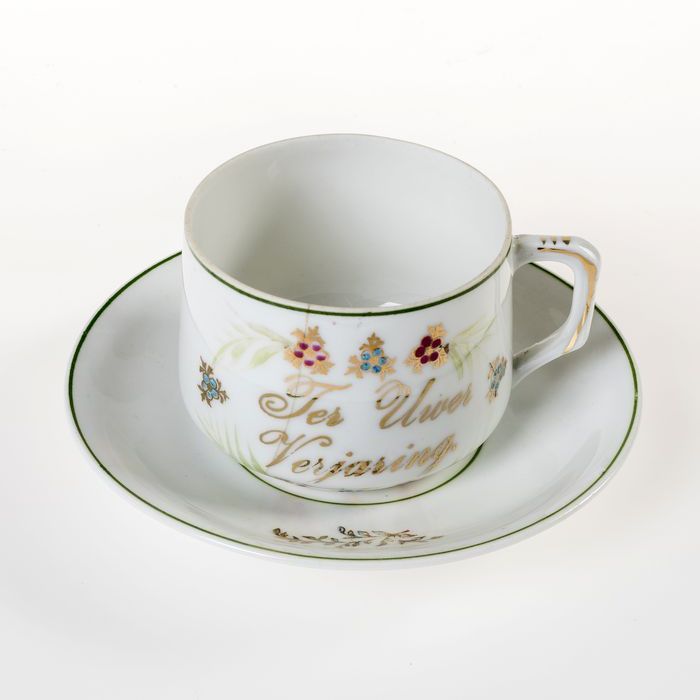 Witte kop en schotel met decoratie, ter gelegenheid ...