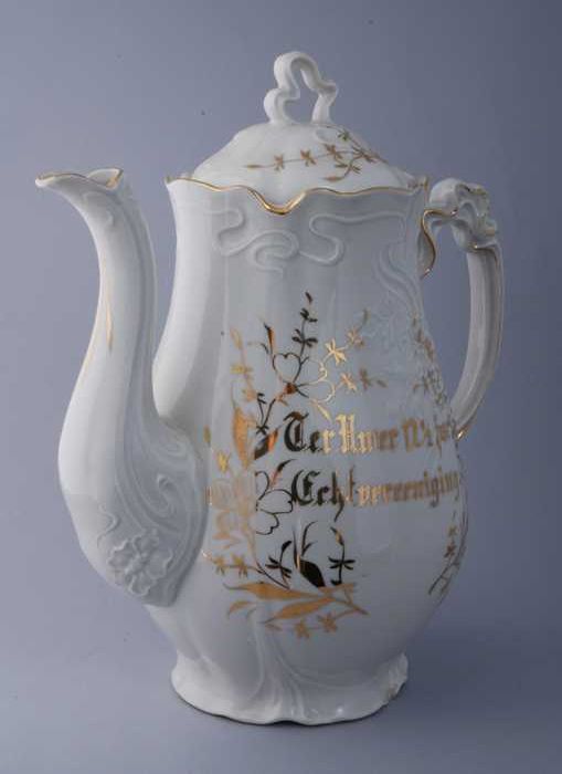 Witte theepot met goudkleurige randen, bloemen en "T...