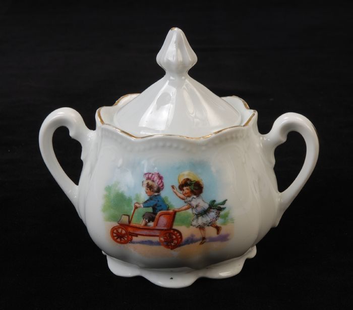 Witte suikerpot van kinderservies met jongen en meis...