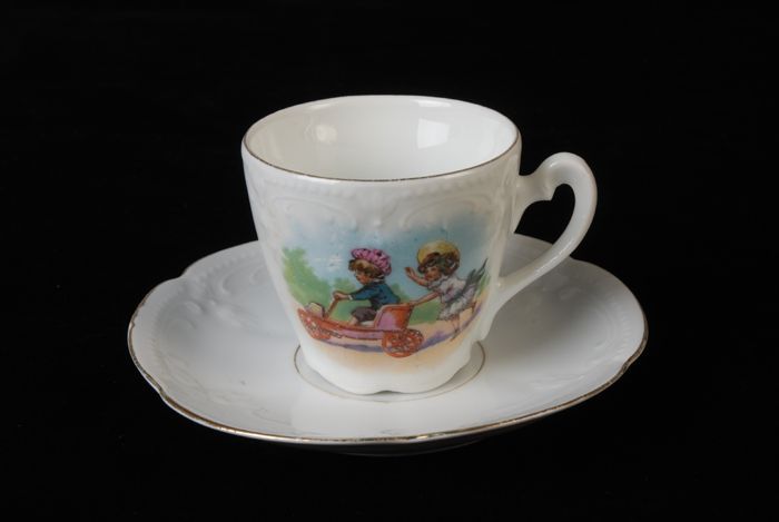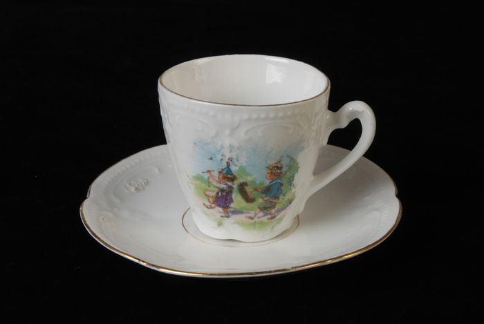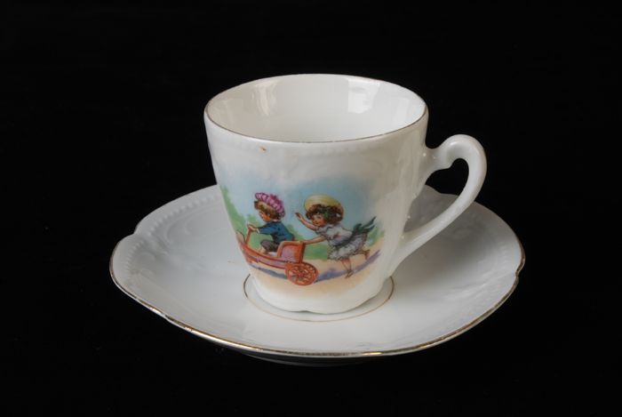 Witte kop en schotel van kinderservies waarop jongen...