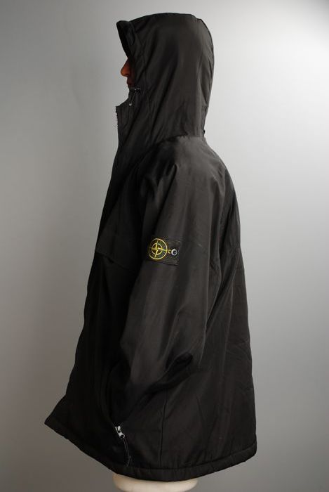 Lange zwarte jas met capuchon, merk Stone Island, me...