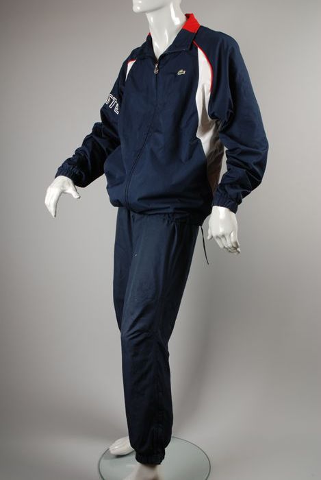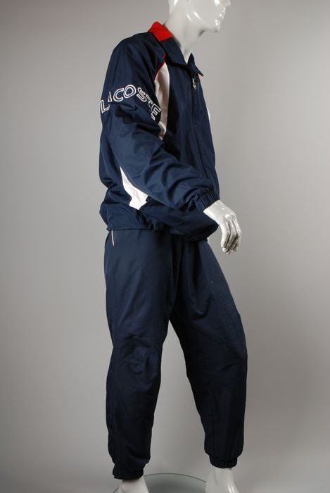 Blauwe trainingsbroek van merk Lacoste met rood-witt...