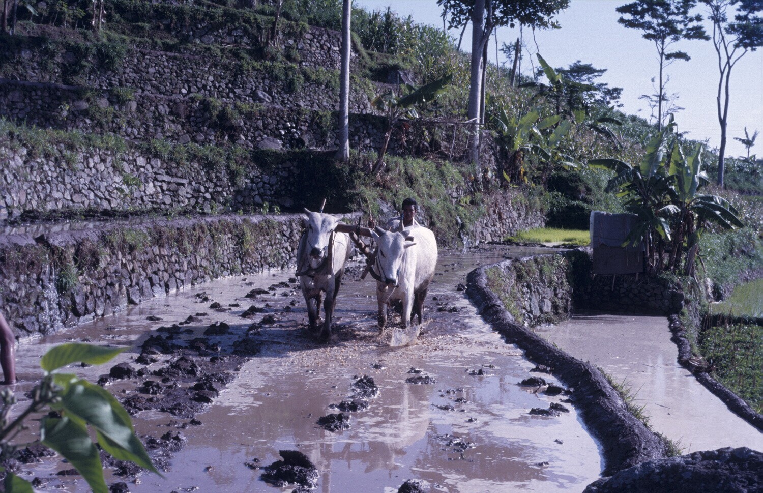Oost Java. Het ploegen met ossen van een sawahveldje.