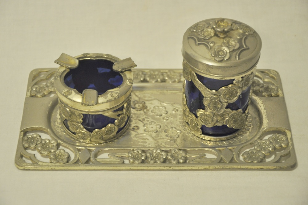 Asbak en sigarettenhouder van glas en metaal op een ...