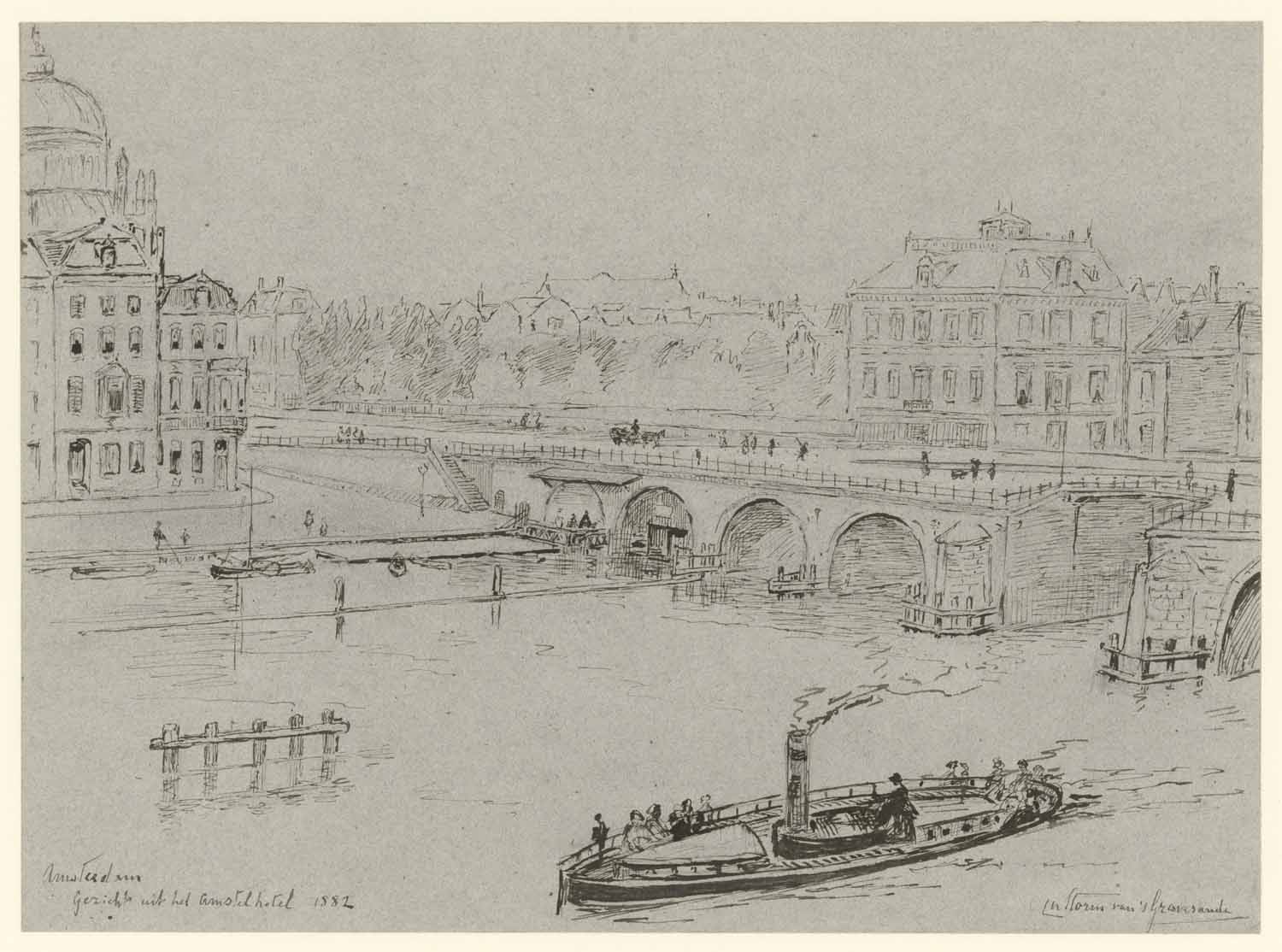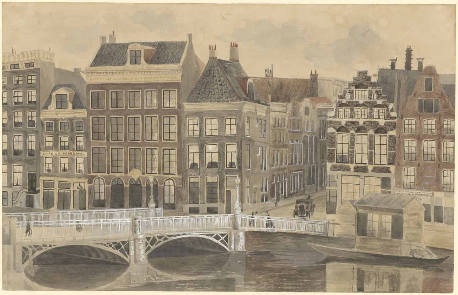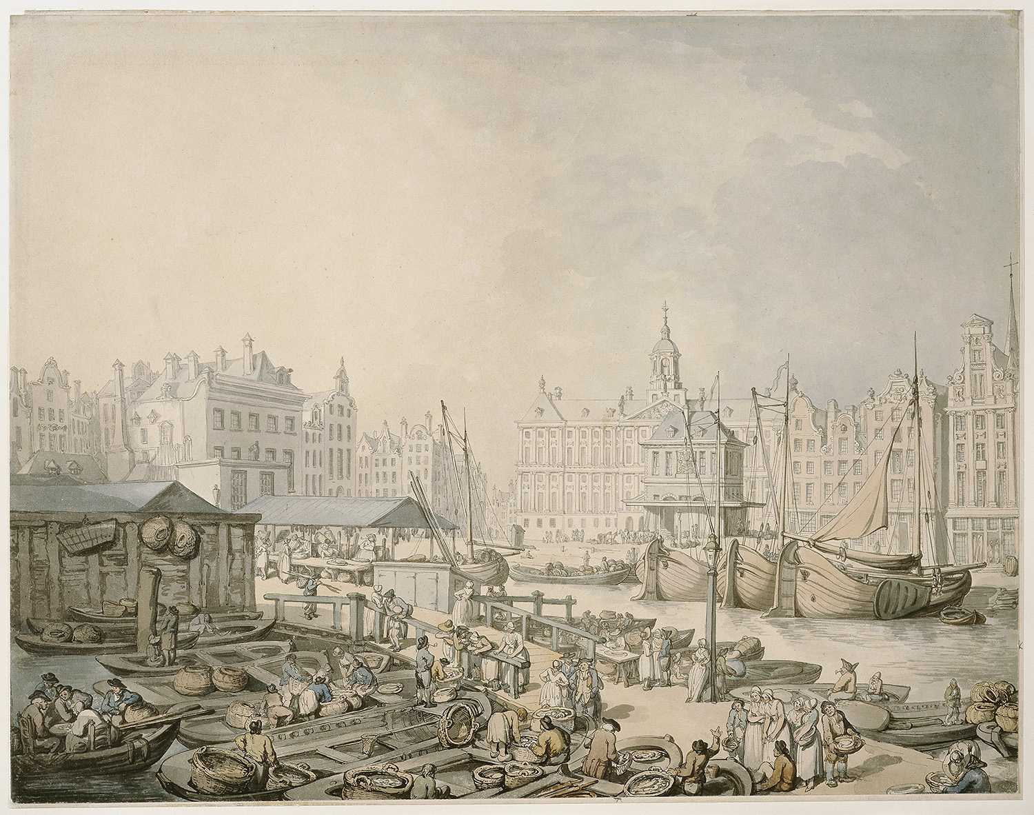 De vismarkt bij de Dam te Amsterdam met het Stadhuis...