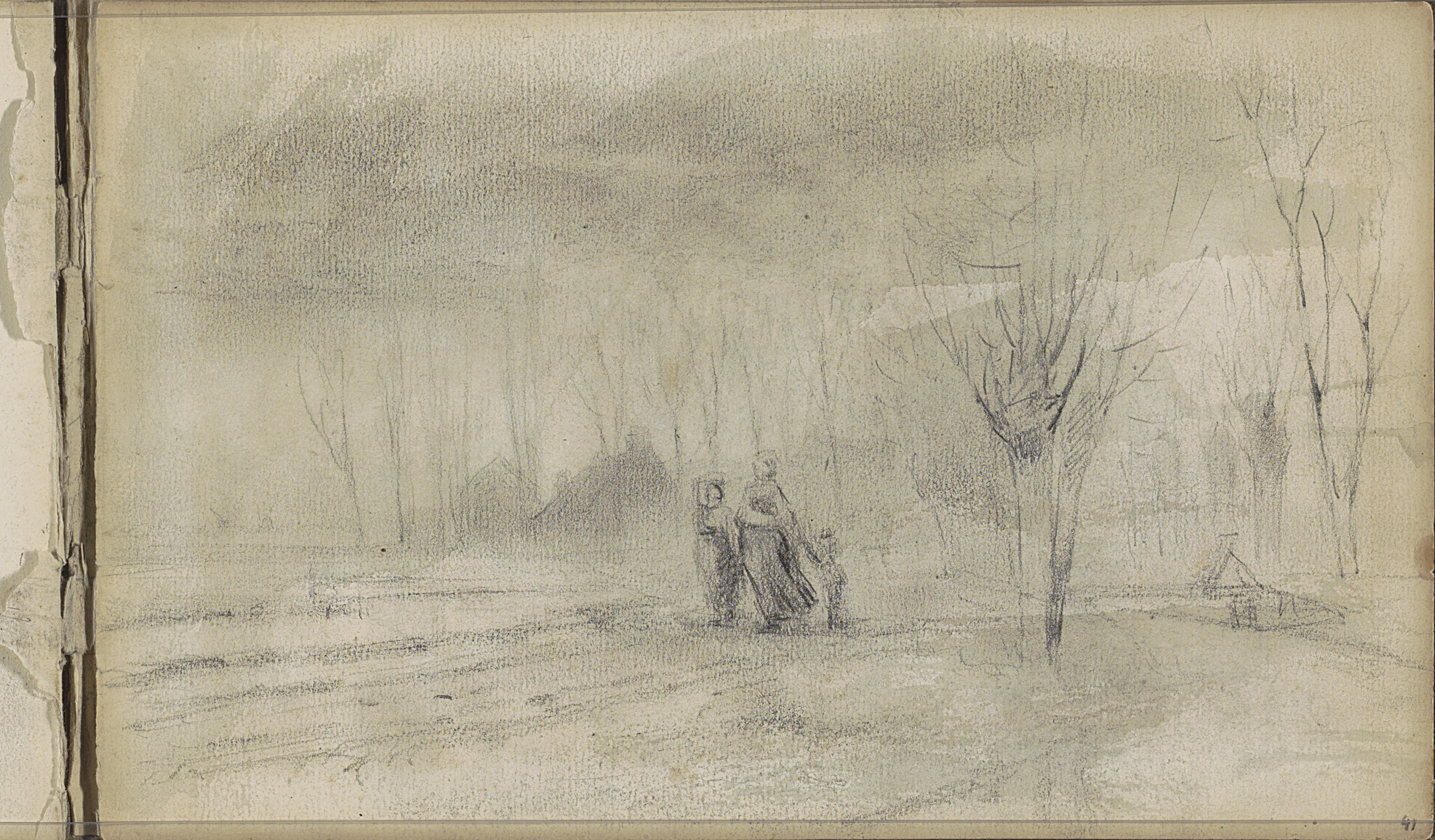 Figuur bij een bomengroep naast een kerk