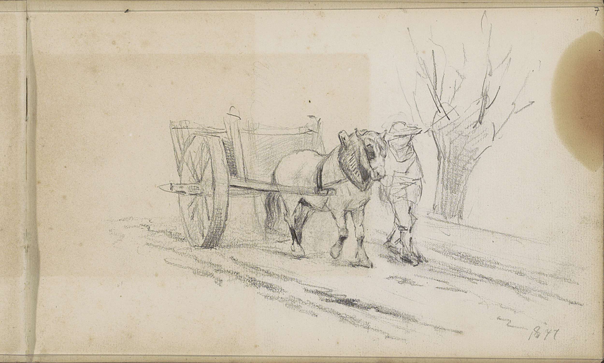 Gesluierde figuur met een paardenkar op een pad