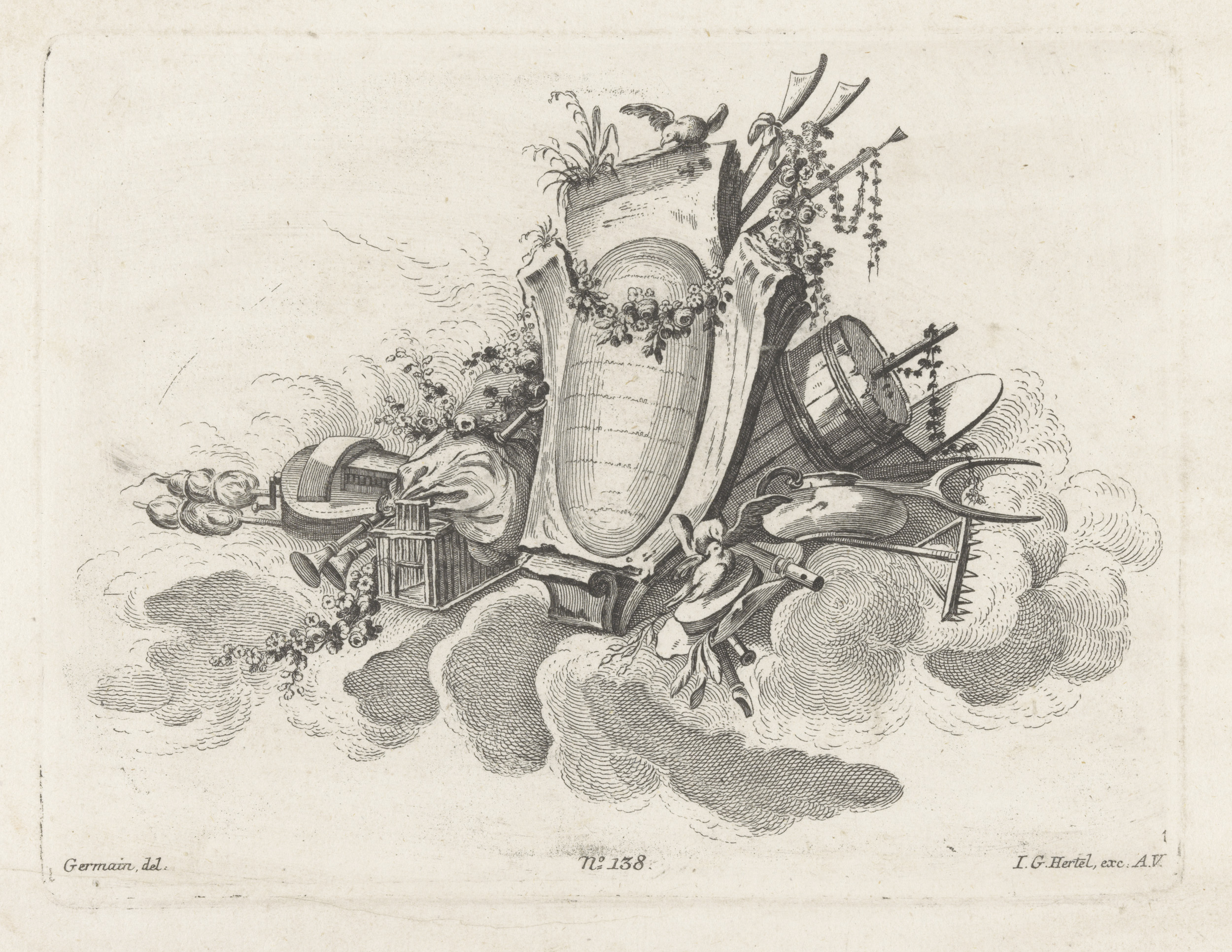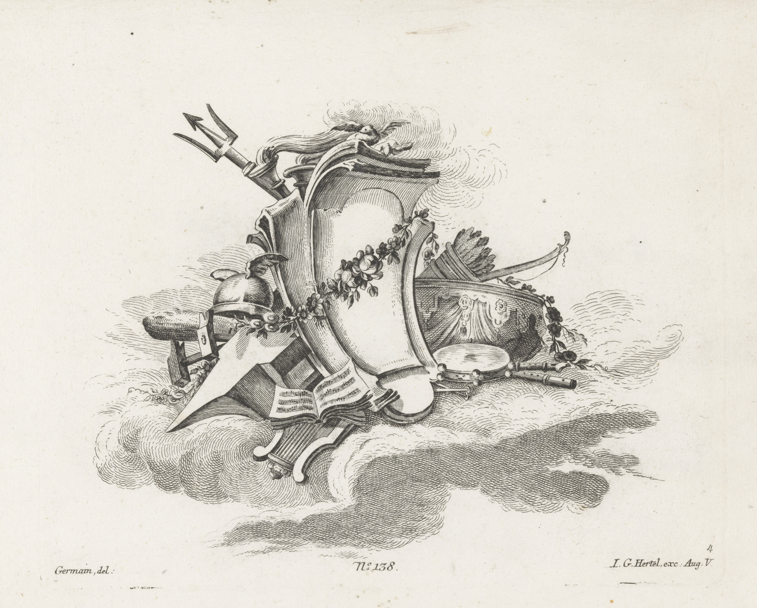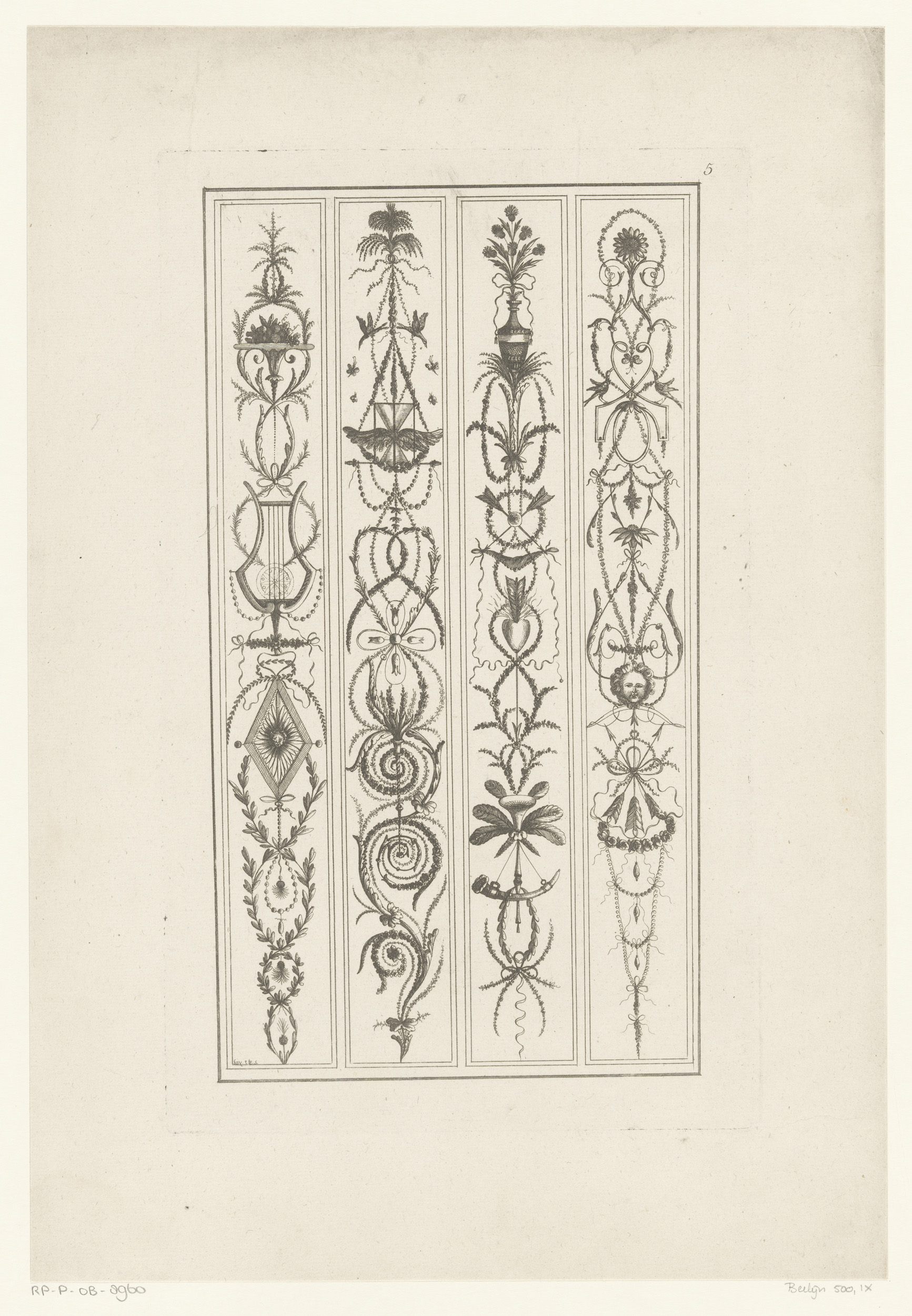 Arabesken met lier, zandloper, vaas en pijlen
