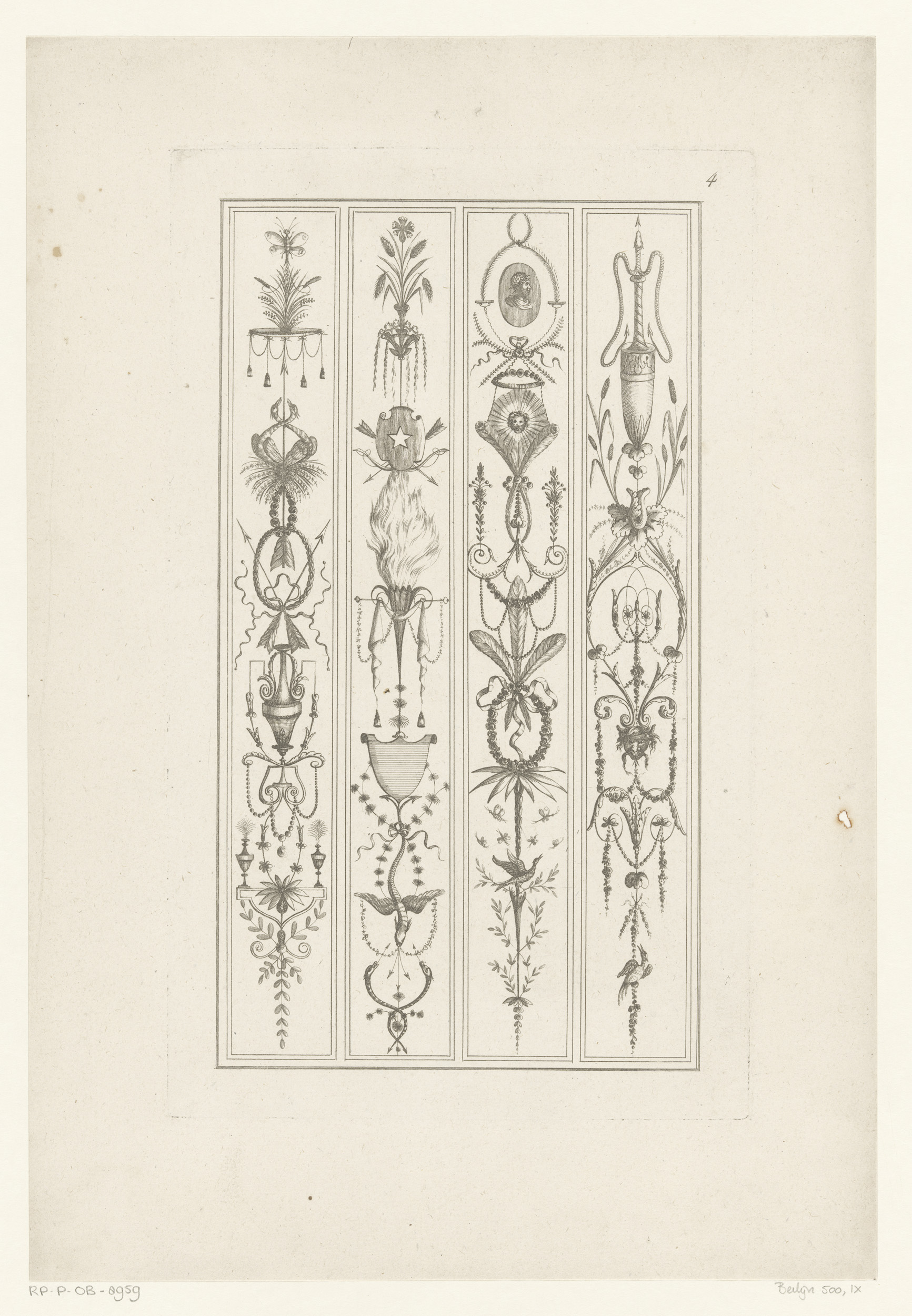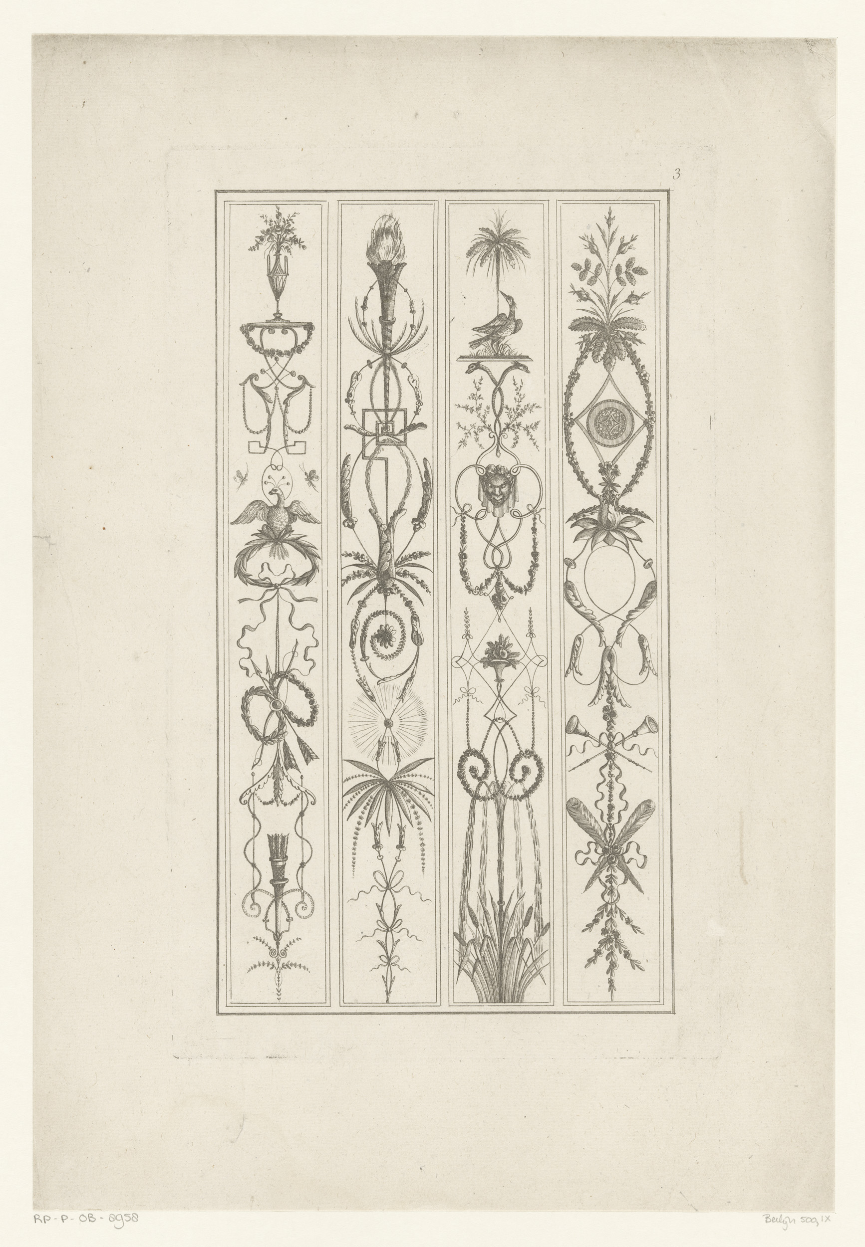 Arabesken met vazen, fakkel en veren