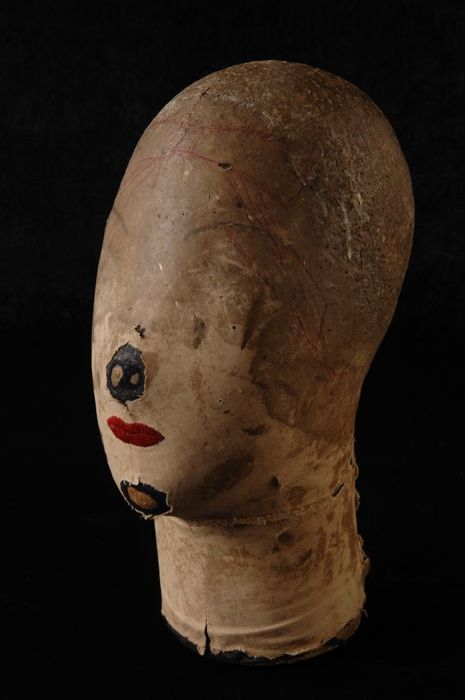 Paspop, hoofd om hoeden op te passen, met geborduurd...
