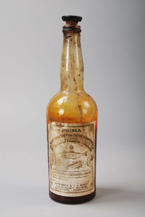Ronde levertraanfles met "Prima Lofodinsche Medicijn...