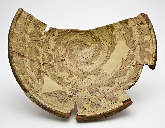 Fragment aardewerk schotel met versiering in slibtec...
