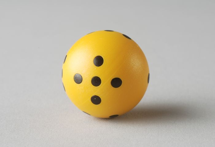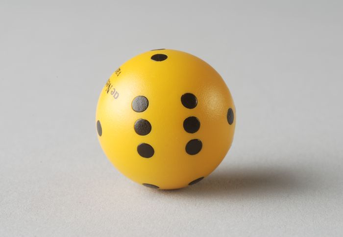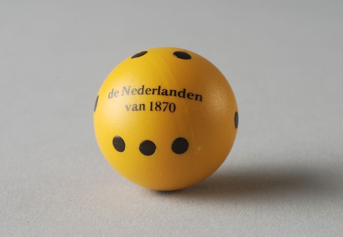 Gele ronde dobbelsteen met zwarte ogen en "de Nederl...