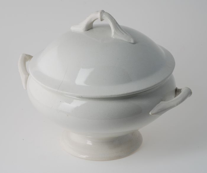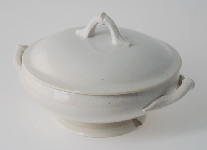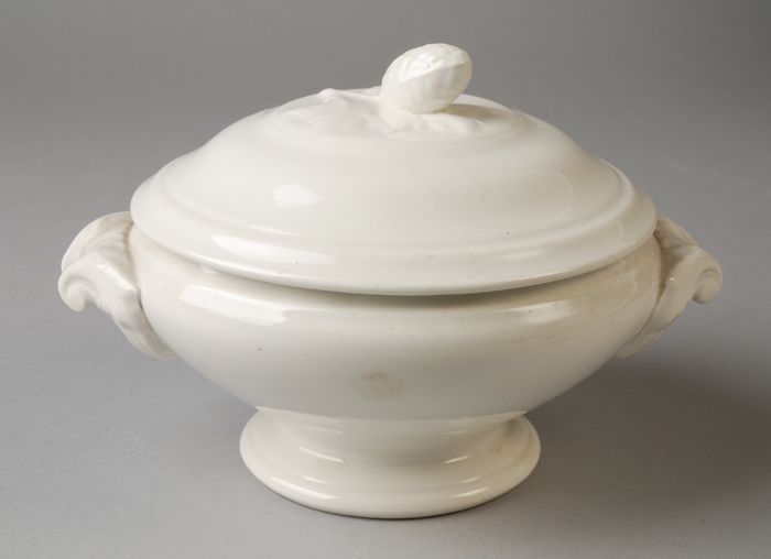 Wit geglazuurde miniatuur soepterrine met twee handg...