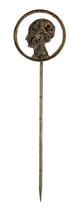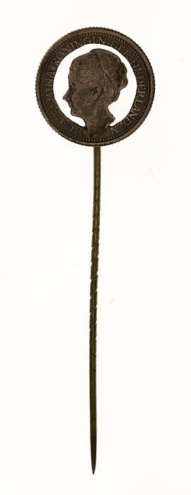 Zilveren dubbeltje, gesoldeerd aan speld