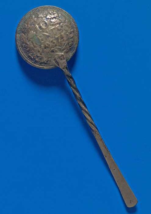 Zoutlepeltje, gemaakt van dubbeltje uit 1937