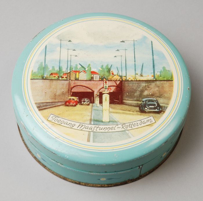 Rond blik met los deksel, Maastunnel-ingang, lichtbl...