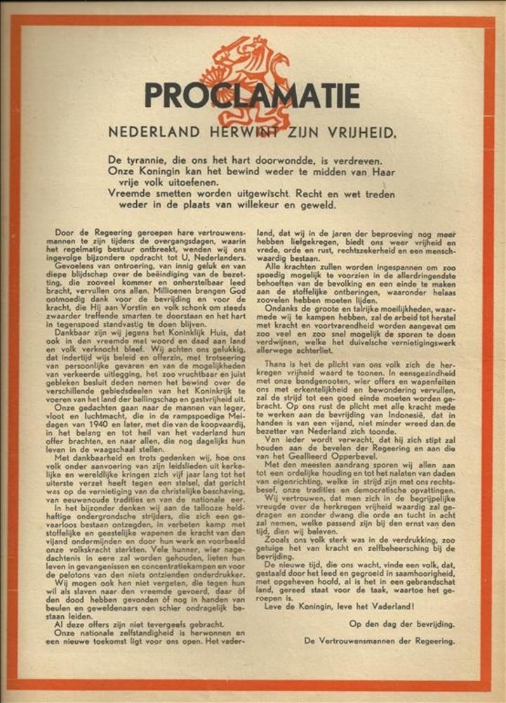 Proclamatie. Nederland herwint zijn vrijheid.