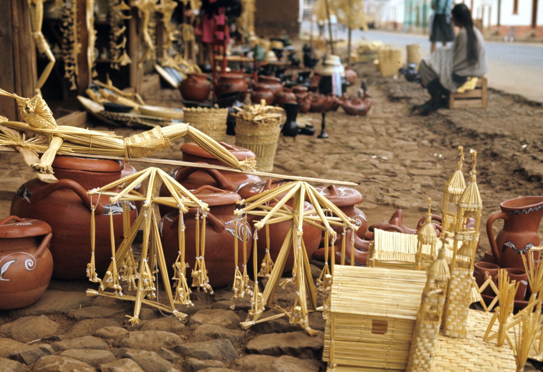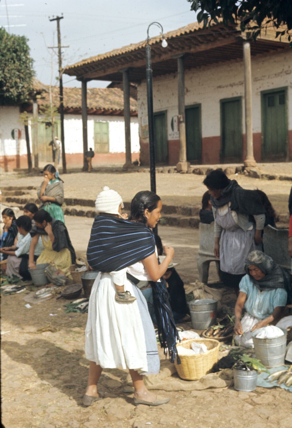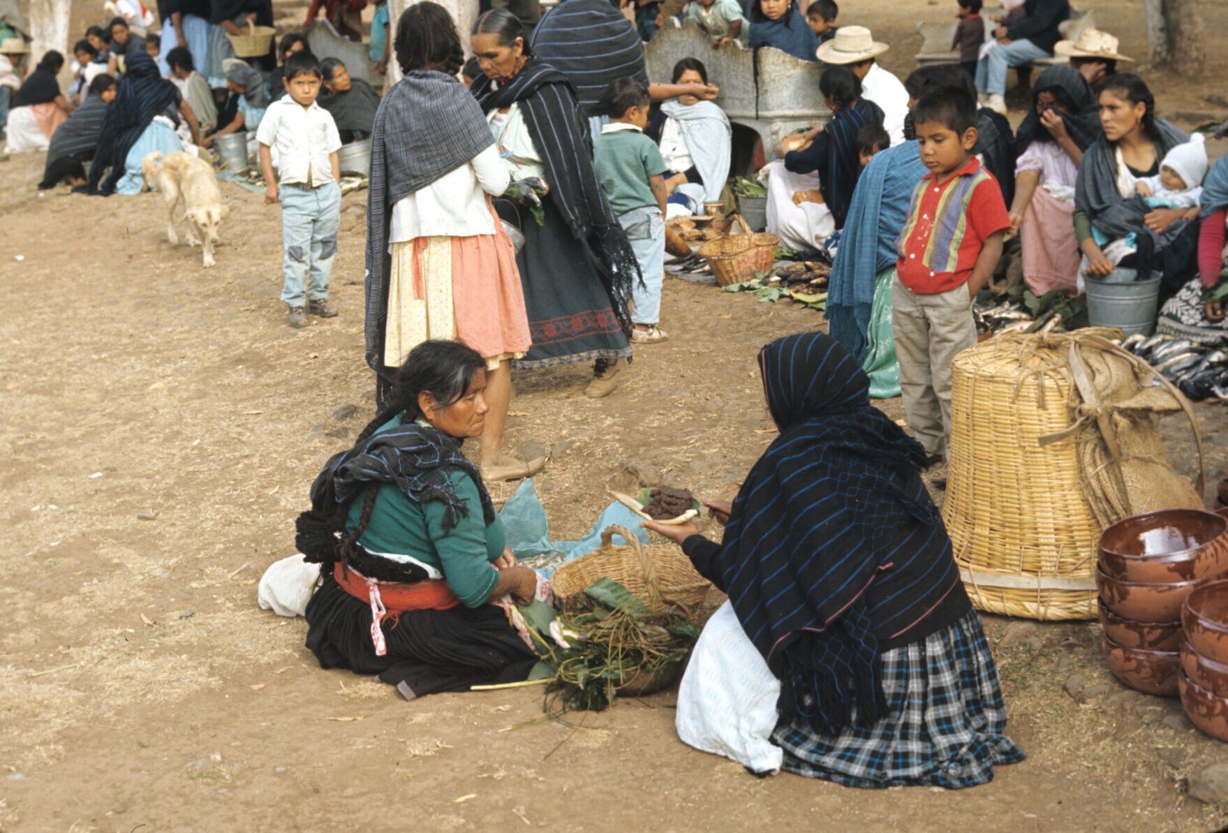 mannen in jorongo (poncho) op groenten- en fruitmarkt