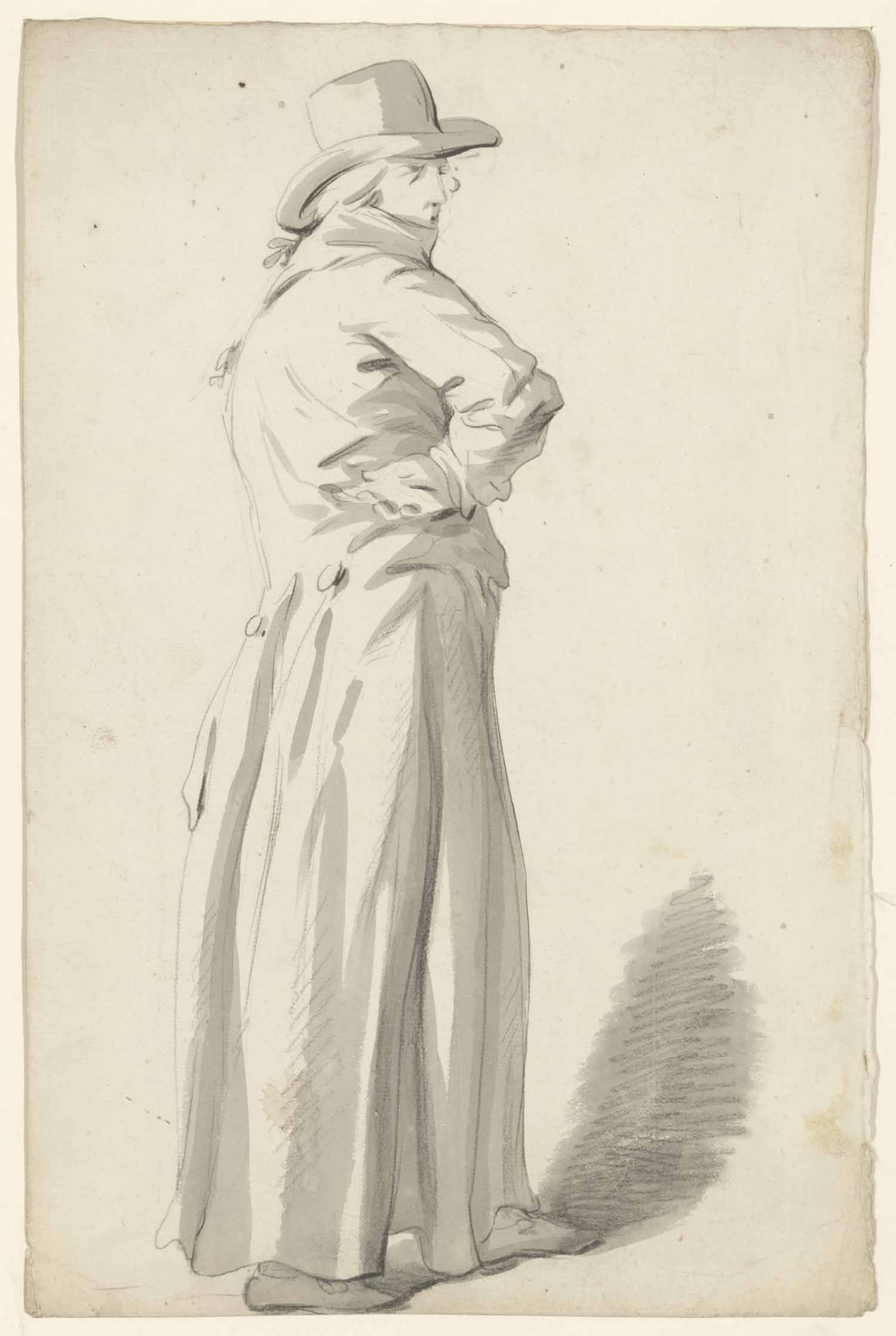 Man in lange jas, arm in de zijde gesteund