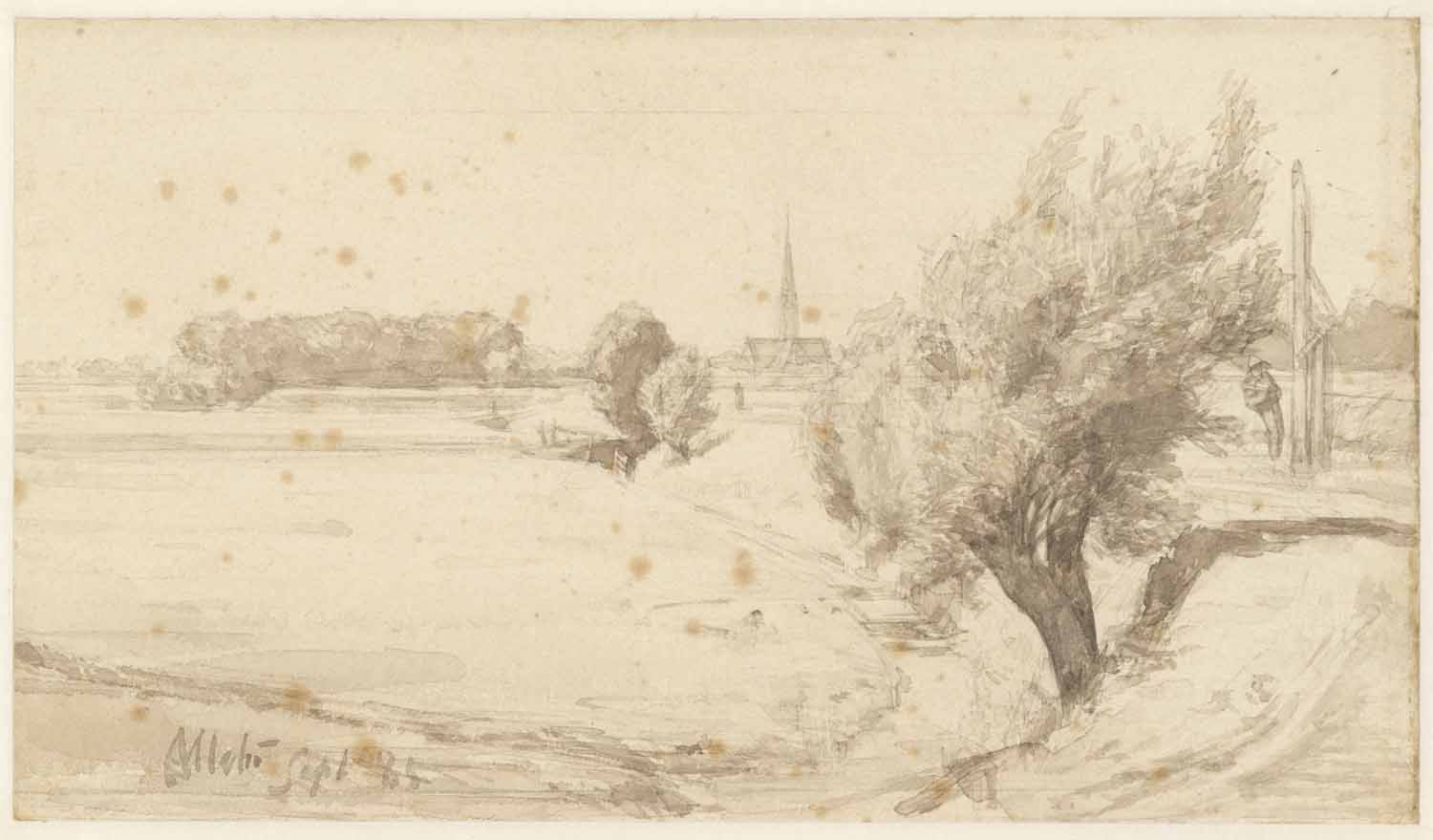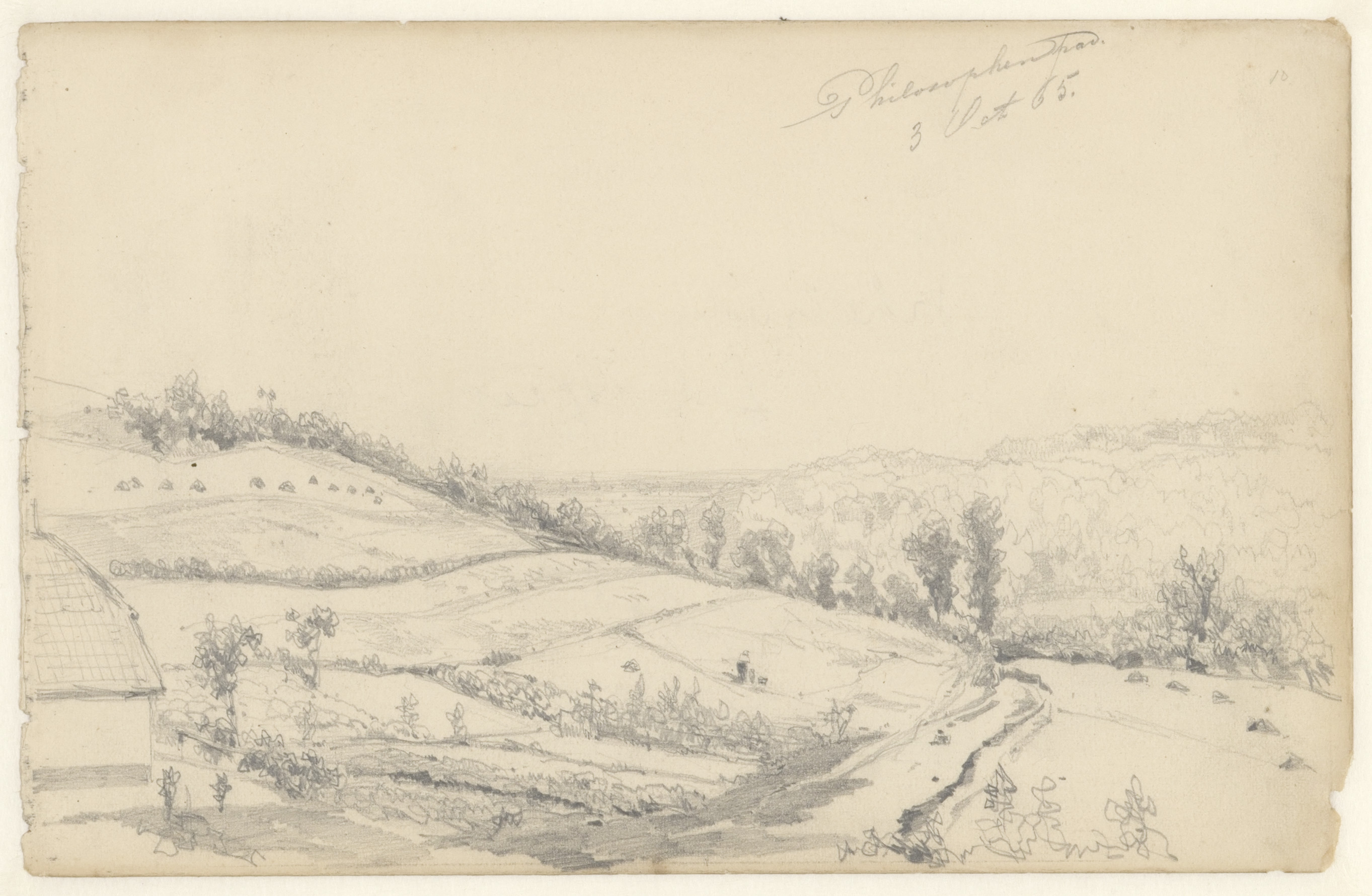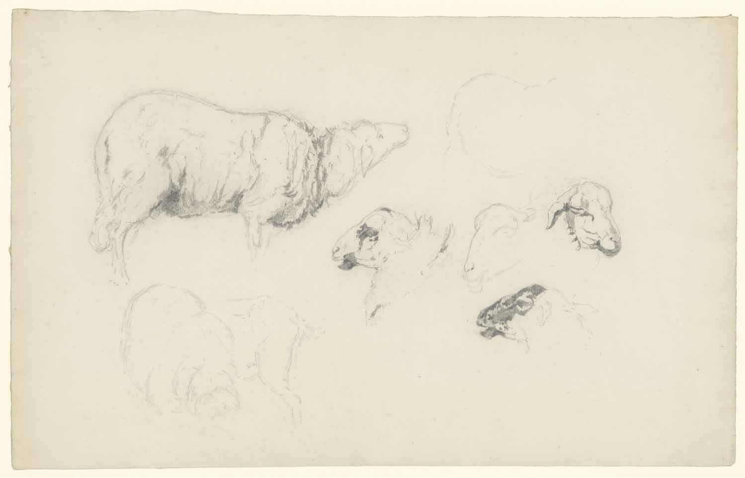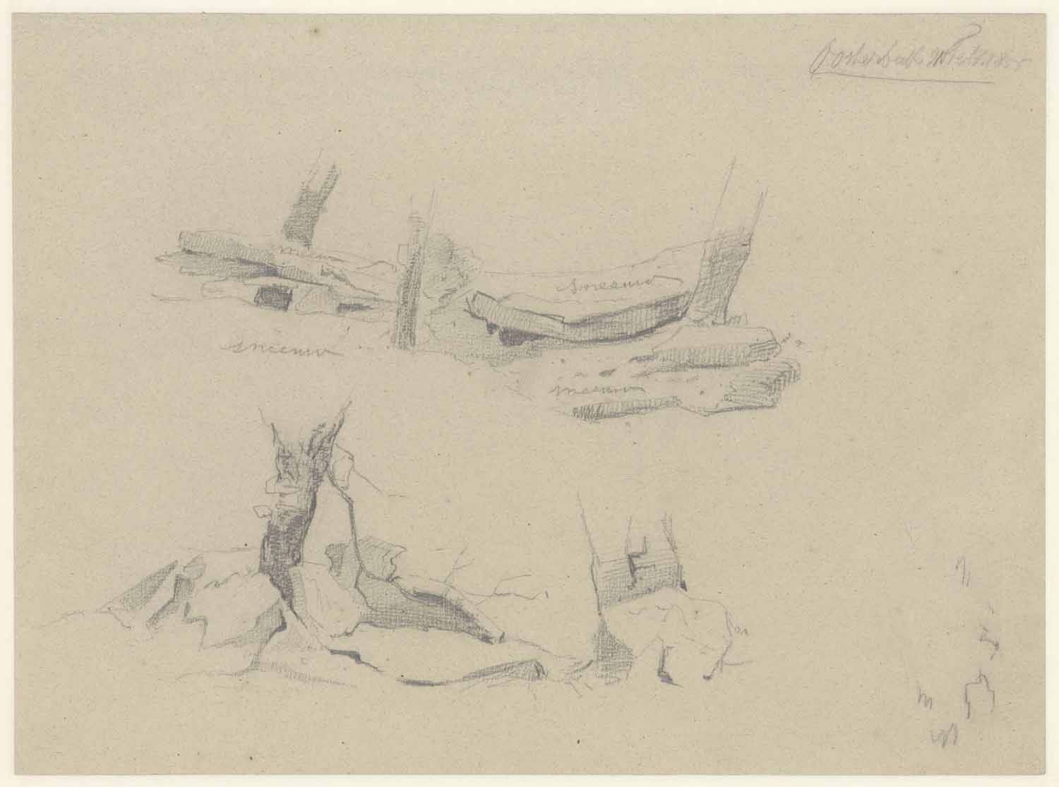 Portret en caricatuurstudies. verso: Landschapstudie
