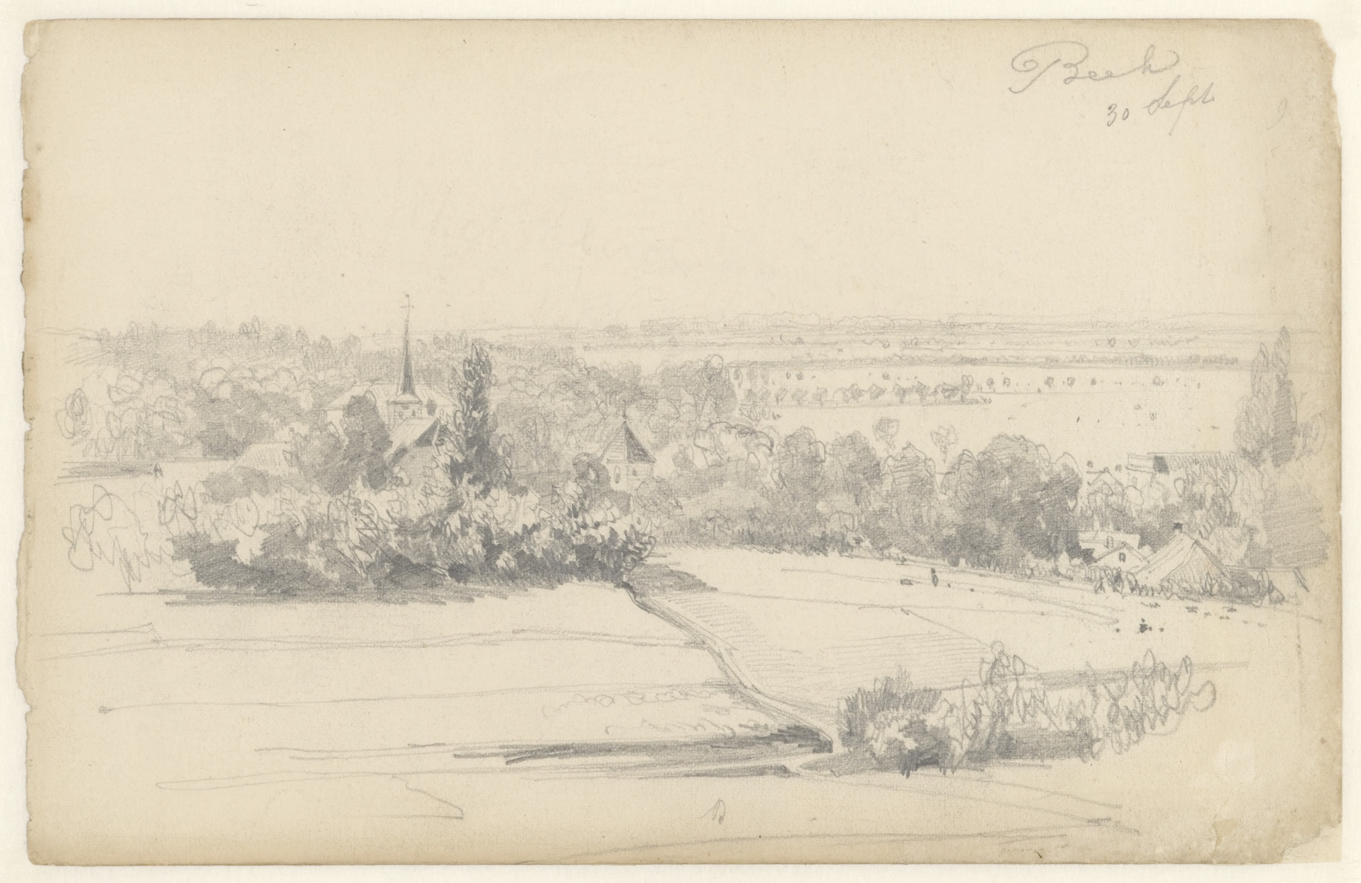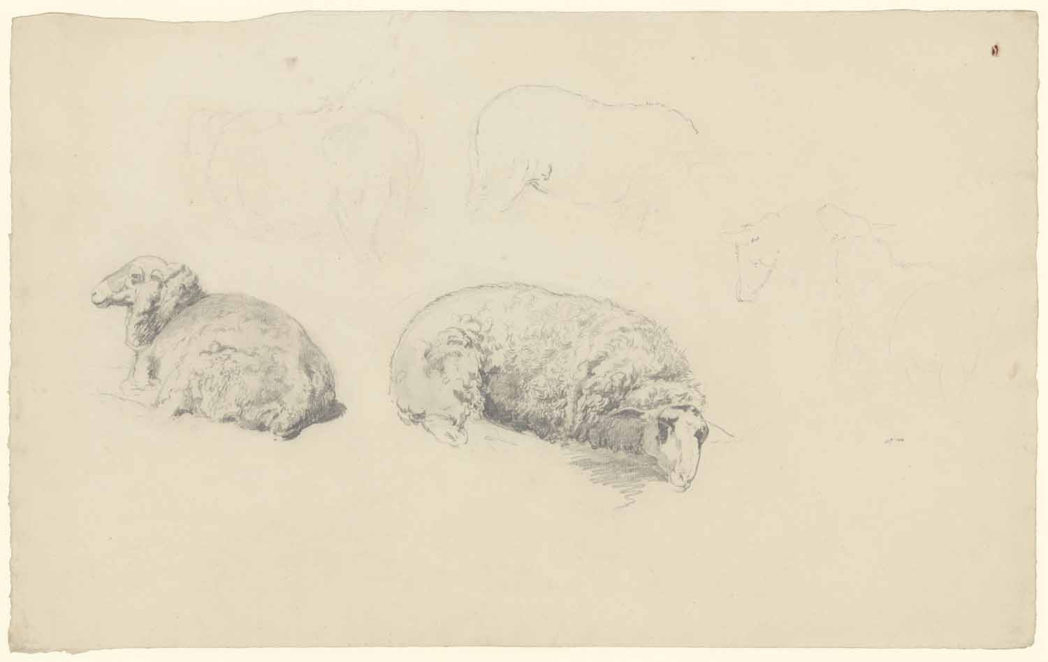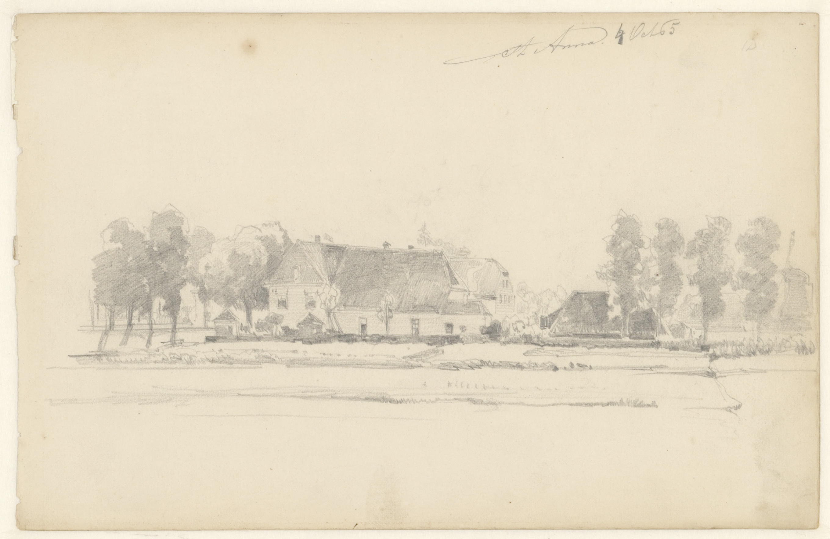 Portret en caricatuurstudies. verso: Landschapstudie