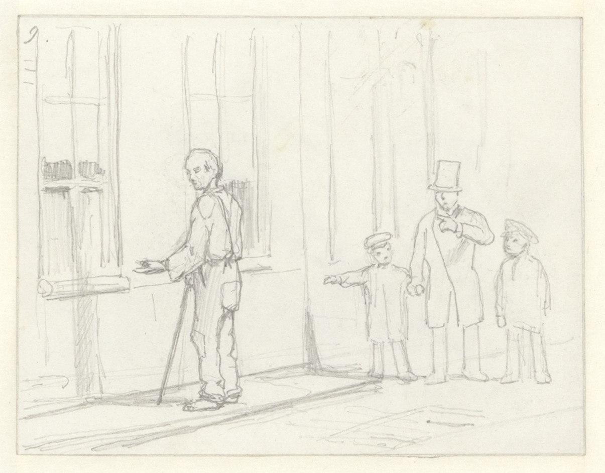 Bedelaar en vader met twee kindern