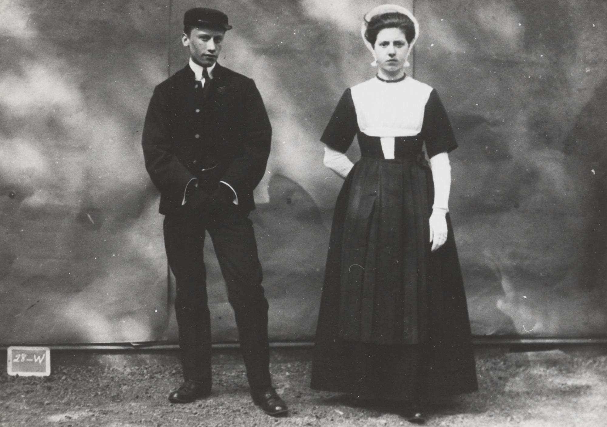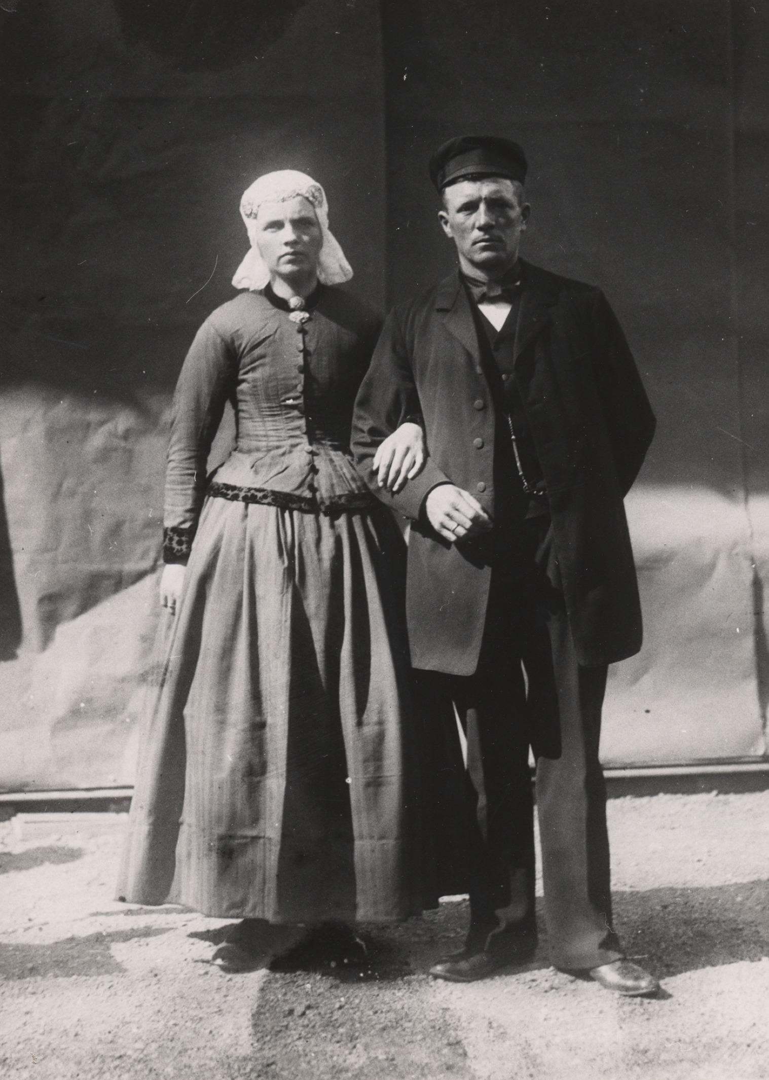 Vrouw en man in Scheveningse streekdracht, 1913 (zwa...