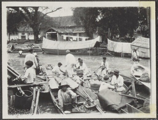 Vrouwen op Palembang met kalebassen om water te gaan...