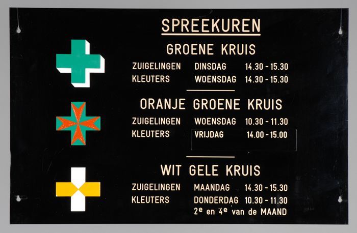 Zwart kunststof bord met aanduiding van de spreekure...