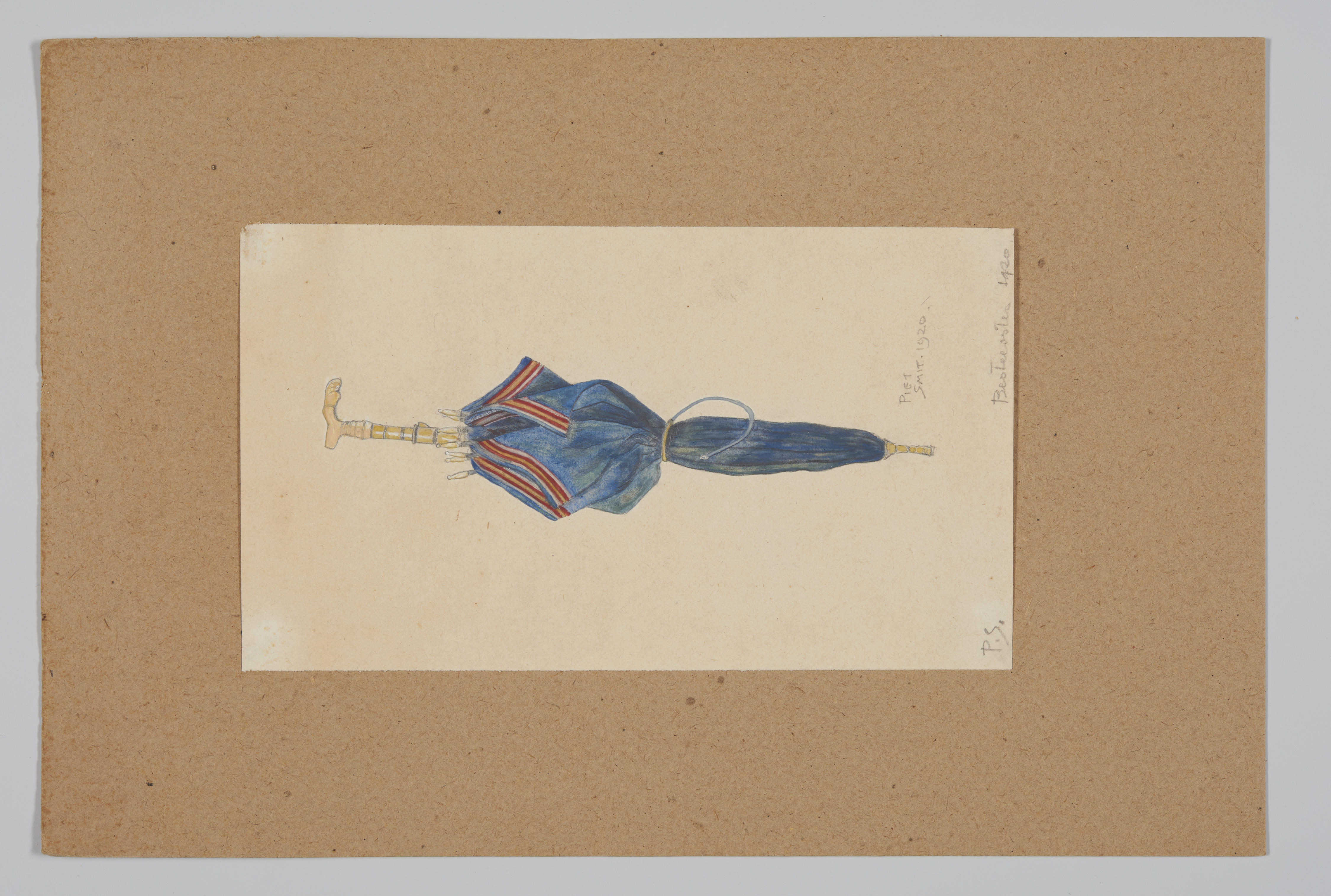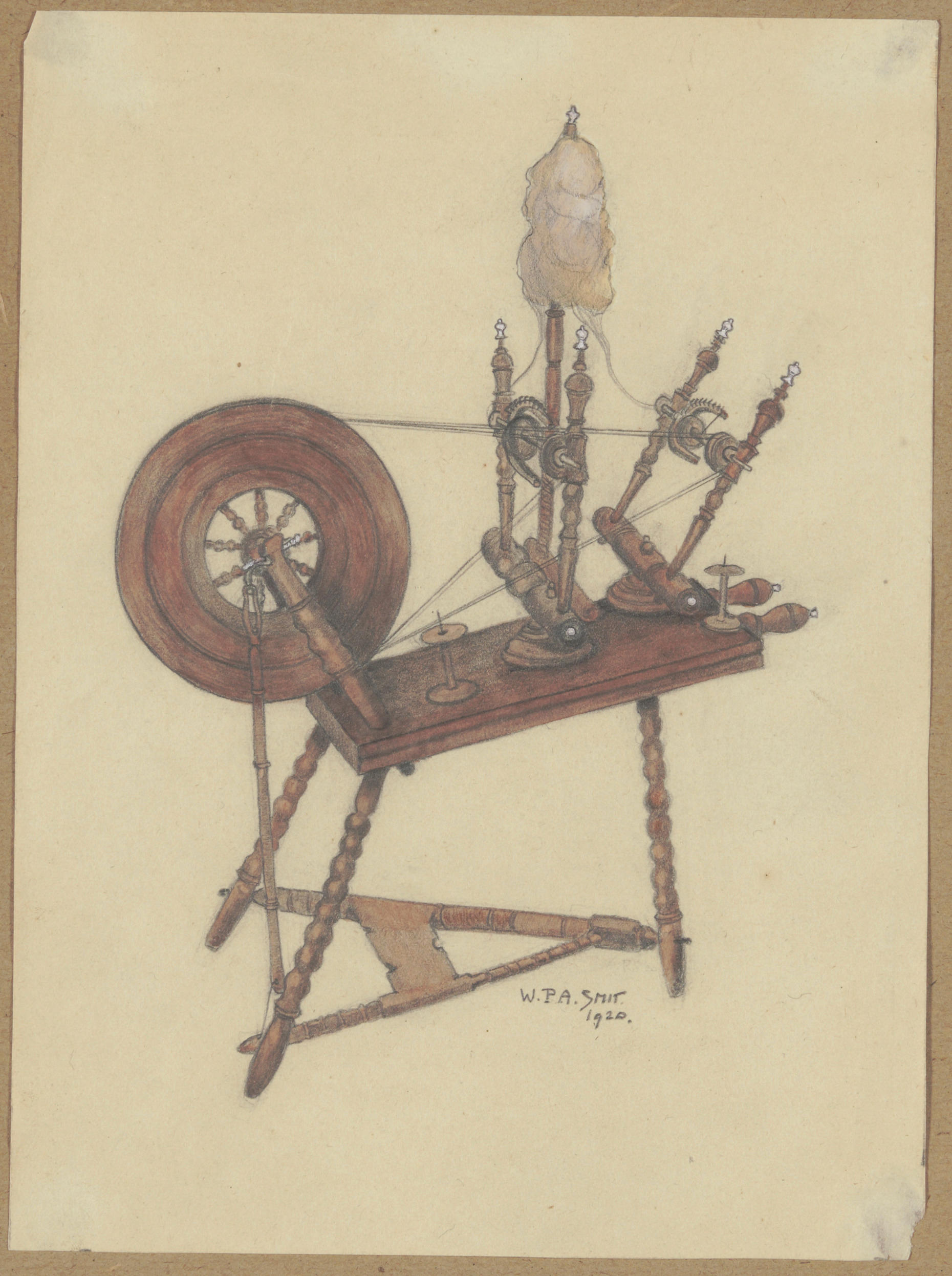 Geaquarelleerde potloodtekening van een spinnewiel, ...