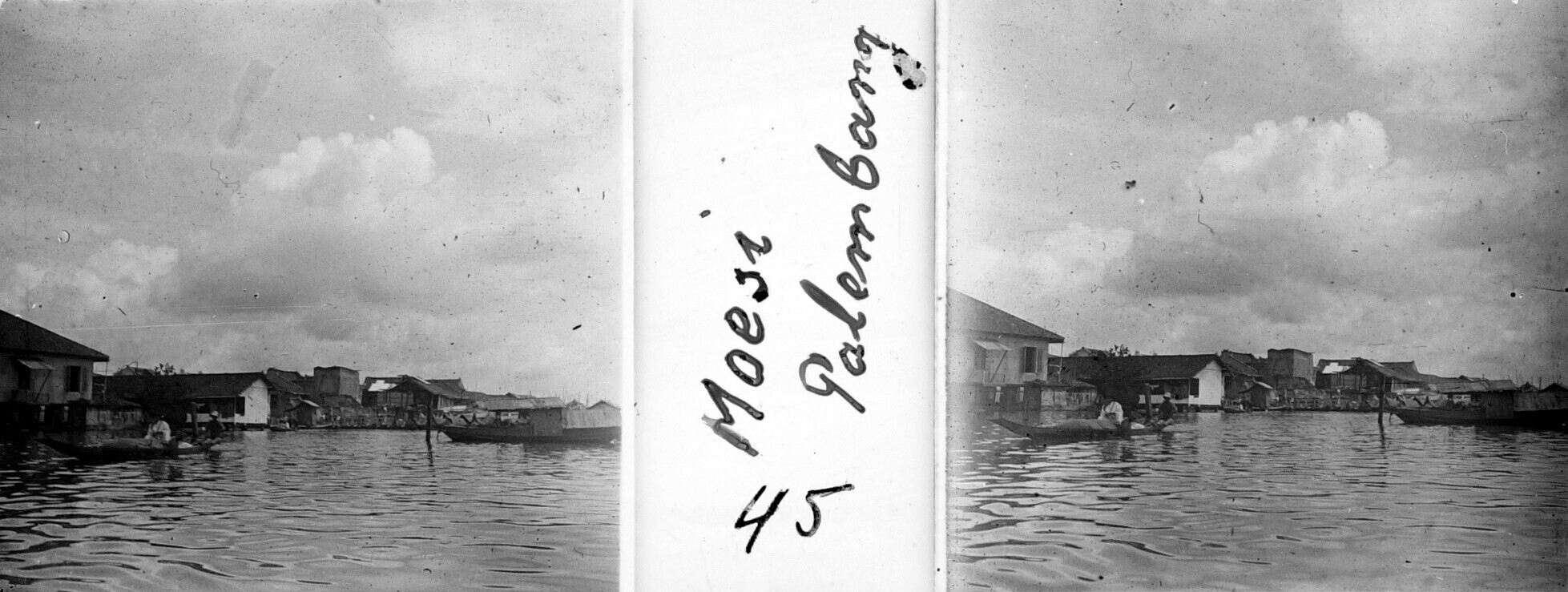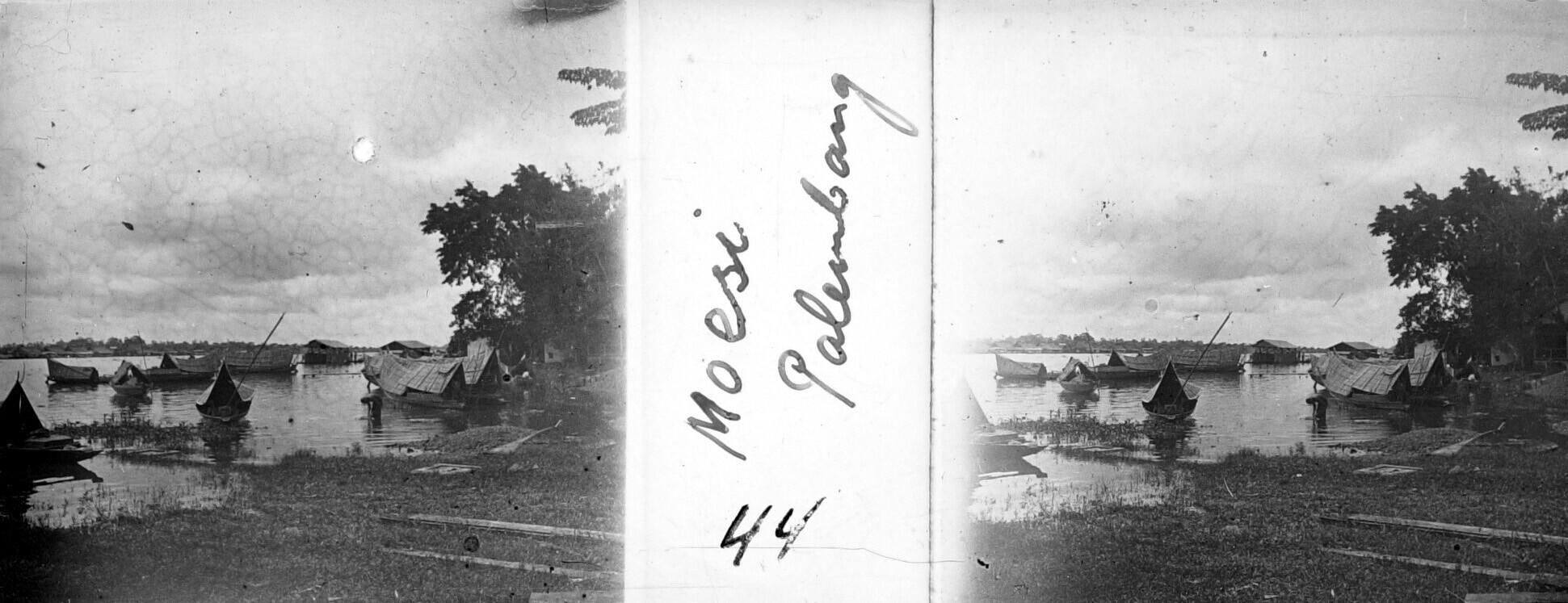 Handelsvaartuigen langs de kant van de rivier Musi t...