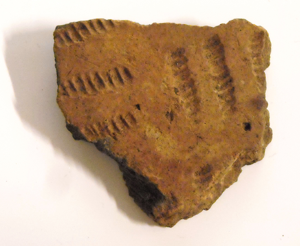 Scherf van een urn, met inkervingen, gevonden in Spe...