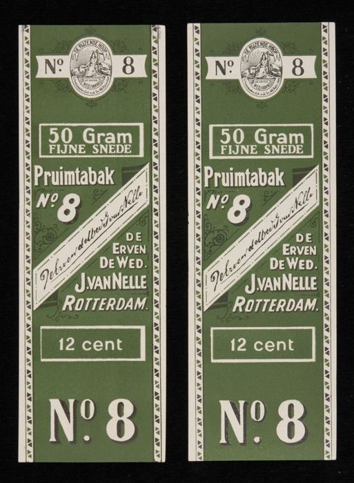 Twee groene labels VAN NELLE PRUIMTABAK, No. 8, 50 g...