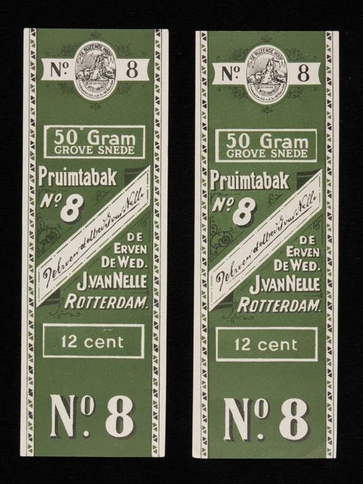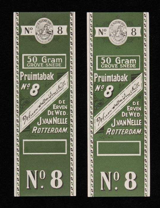 Twee groene labels VAN NELLE PRUIMTABAK, No. 8, 50 gram