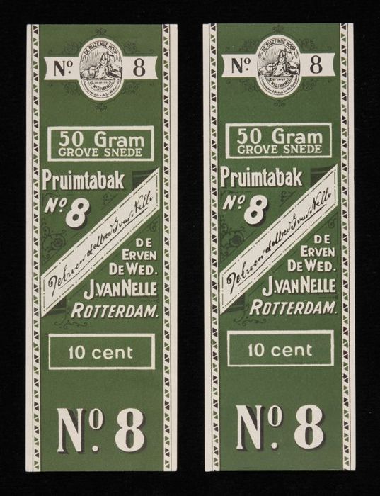 Twee groene labels VAN NELLE PRUIMTABAK, No. 10, 50 ...