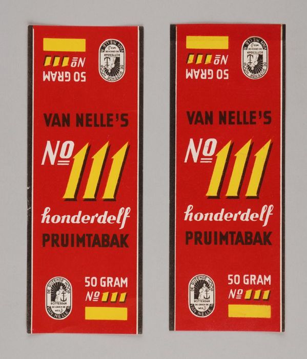 Twee rode labels VAN NELLE'S PRUIMTABAK, No. 111, 56...