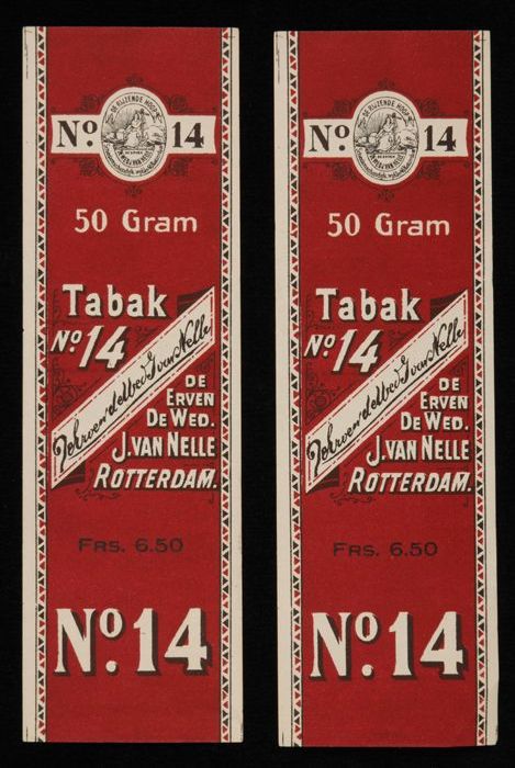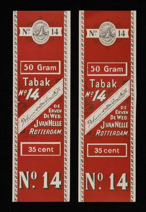 Twee donkerrode labels VAN NELLE TABAK, No. 14, 100 ...