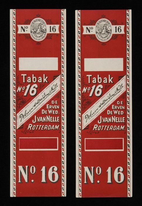 Twee donkerrode labels VAN NELLE TABAK, No. 16