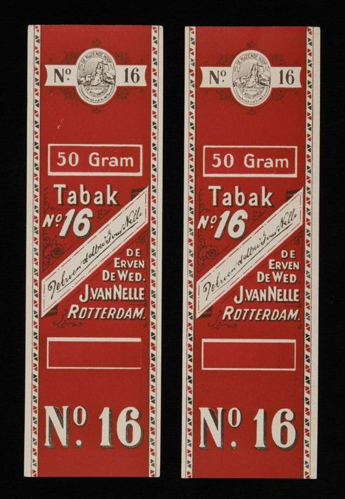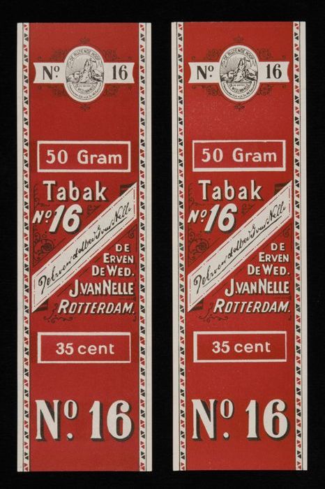 Twee donkerrode labels VAN NELLE TABAK, No. 16, 50 g...