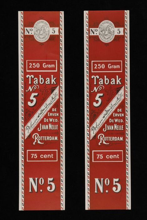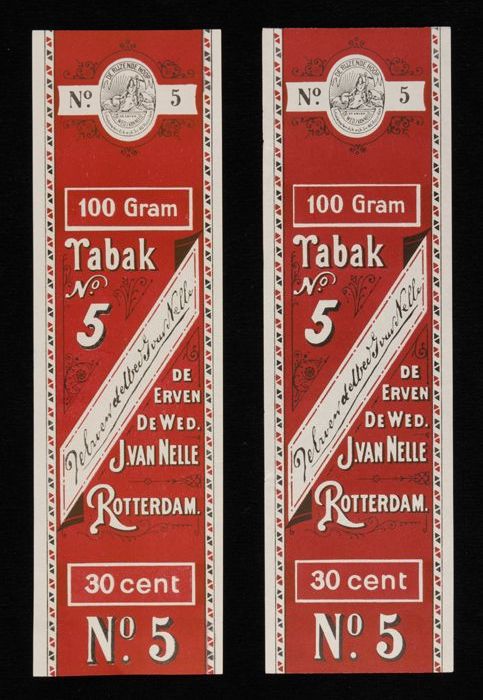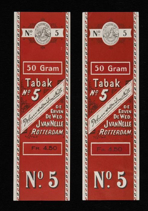 Twee donkerrode labels VAN NELLE TABAK, No. 5, 50 gr...