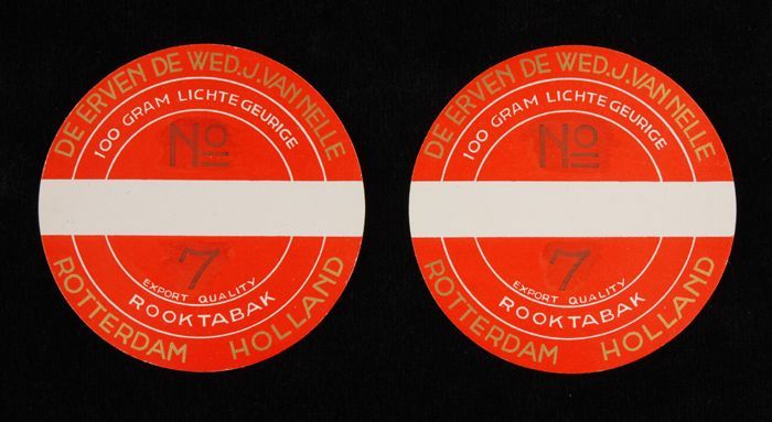 Twee rode, ronde labels VAN NELLE TABAK, No. 7, 100 ...